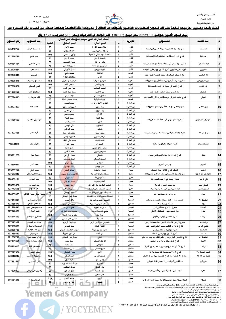 كما نشرت الشركة اليمنية للغاز في وقت لاحق، كشف محطات تعبئة اسطوانات المواطنين من الغاز المستورد عبر العقال اليوم الاثنين الموافق 11 أبريل، في أمانة العاصمة ومحافظة صنعاء، مشيرة إلى أن السعر الرسمي للاسطوانة ( ٧,٧٨٣ ريال ).
