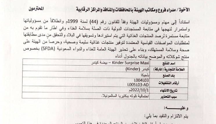 اقرت الهيئة اليمنية للمواصفات والمقاييس وضبط الجودة منع دخول منتج شوكولاتة أطفال “”بيض كيندر سربرايز ماكسي” المصنع في بلجيكا بسبب احتمالية تلوثه ببكتيريا السالمونيلا .