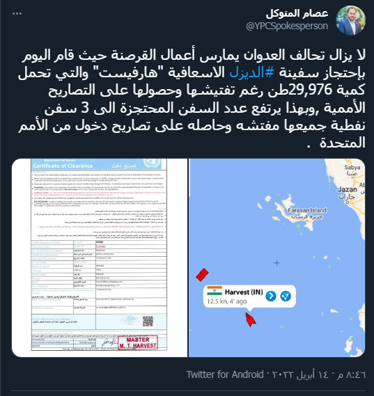 وقال المتحدث الرسمي لشركة النفط، عصام المتوكل، في تغريدة على حسابه في “تويتر” :”لا يزال تحالف العدوان يمارس أعمال القرصنة حيث قام اليوم بإحتجاز سفينة الديزل الاسعافية “هارفيست” والتي تحمل كمية 29,976 طن.”