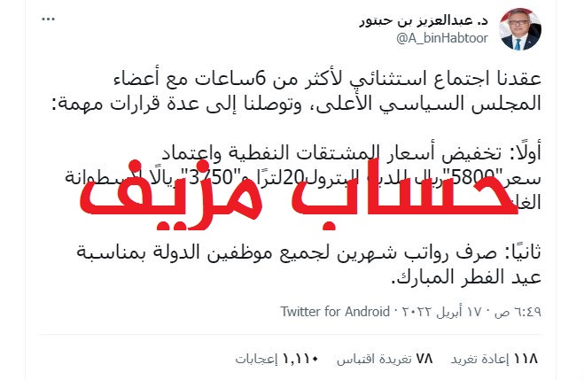 ولقي ما نشره الحساب المزيف باسم بن حبتور على تويتر، تفاعل كبير خلال وقت وجيز، وتضمنت تغريدته أنه جرى عقد “اجتماع استثنائي لأكثر من 6 ساعات مع أعضاء المجلس السياسي الأعلى، وتوصلنا إلى عدة قرارات مهمة: أولًا: تخفيض أسعار المشتقات النفطية واعتماد سعر”5800″ريال للدبة البترول 20 لتراً و”3750″ريالاً لأسطوانة الغاز. ثانياً: صرف رواتب شهرين لجميع موظفين الدولة بمناسبة عيد الفطر المبارك”.