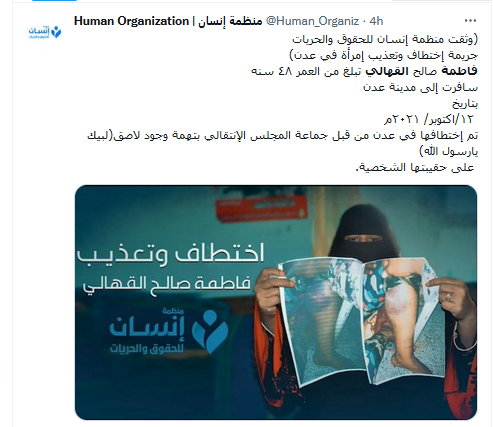 منظمة إنسان للحقوق والحريات ذهبت إلى منزل المختطفة فاطمة القهالي ووثقت القصة المأساوية من بدايتها حتى خروج فاطمة في الواحد والثلاثين من أكتوبر عام 2021م، وأشارت المنظمة أن المختطفة تعرضت لأساليب تعذيب متعددة كما تم تهديدها بالقتل، فيما تعرضت أسرتها للإبتزاز المالي من خلال تواصل القائمين على سجن البحث الجنائي التابع لمرتزقة الإمارات بخور مكسر في عدن بأسرتها، وأكدت المنظمة أن السبب الوحيد لاختطافها هو حملها ملصقاً على حقيبتها الشخصية يحمل عبارة “لبيك يا رسول الله”.