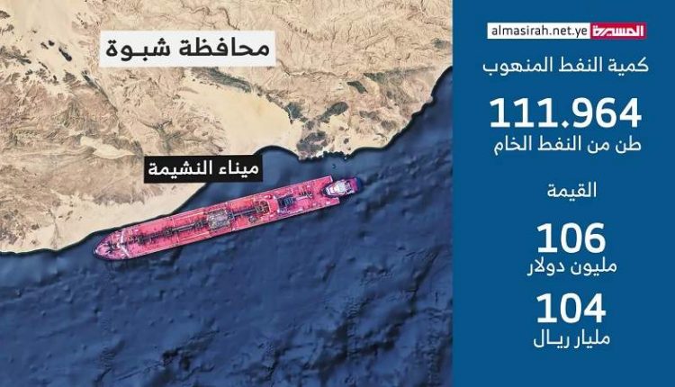 وأشارت المصادر إلى أن قيمة النفط المتوقع نهبه في هذه الشُحنة تبلغ 106 مليون دولار، أي ما يفوق 104 مليار ريال يمني بحسب متوسط أسعار الصرف بالمناطق المحتلة.