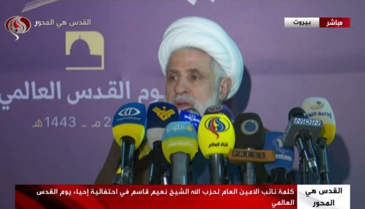 ونقلت الوكالة الوطنية اللبنانية للإعلام عن الشيخ قاسم في كلمته خلال احتفالية إحياء يوم القدس العالمي في بيروت، قوله: إن المشروع الإيراني في المنطقة مشروع ضد الاستكبار ودعم فلسطين وهو مشروع يعطي ولا يأخذ.