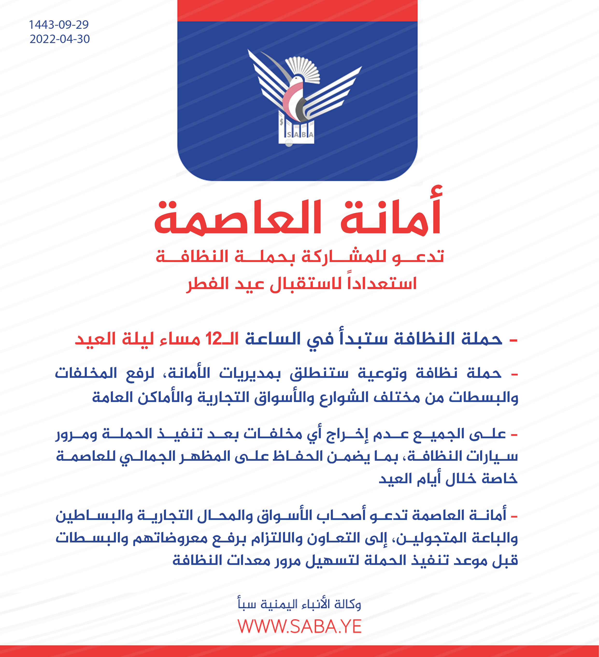 وأوضح أمين العاصمة حمود عباد، لوكالة (سبأ) أن حملة النظافة ستبدأ في الساعة الـ 12 مساء ليلة العيد، بمشاركة الأشغال والمرور والأمن والمديريات، وإشراف قيادات ووكلاء أمانة العاصمة ومدراء المديريات وأمناء وأعضاء المجالس المحلية.