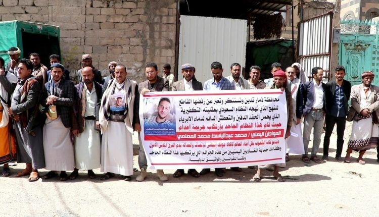 خرج أهالي وأصدقاء الشهيد المغترب محمد عبدالباسط المعلمي الذي قام النظام السعودي باعدامه بدون أي ذنب يذكر في وقفة إحتجاجية بمدينة ذمار للتنديد بالجريمة، مطالبين بمحاكمة هذا النظام المجرم وداعين كل قبائل اليمن إلى النكف ورفد الجبهات لمواجهة النظام السعودي العميل الذي يقتل أبناء الأمة الإسلامية.