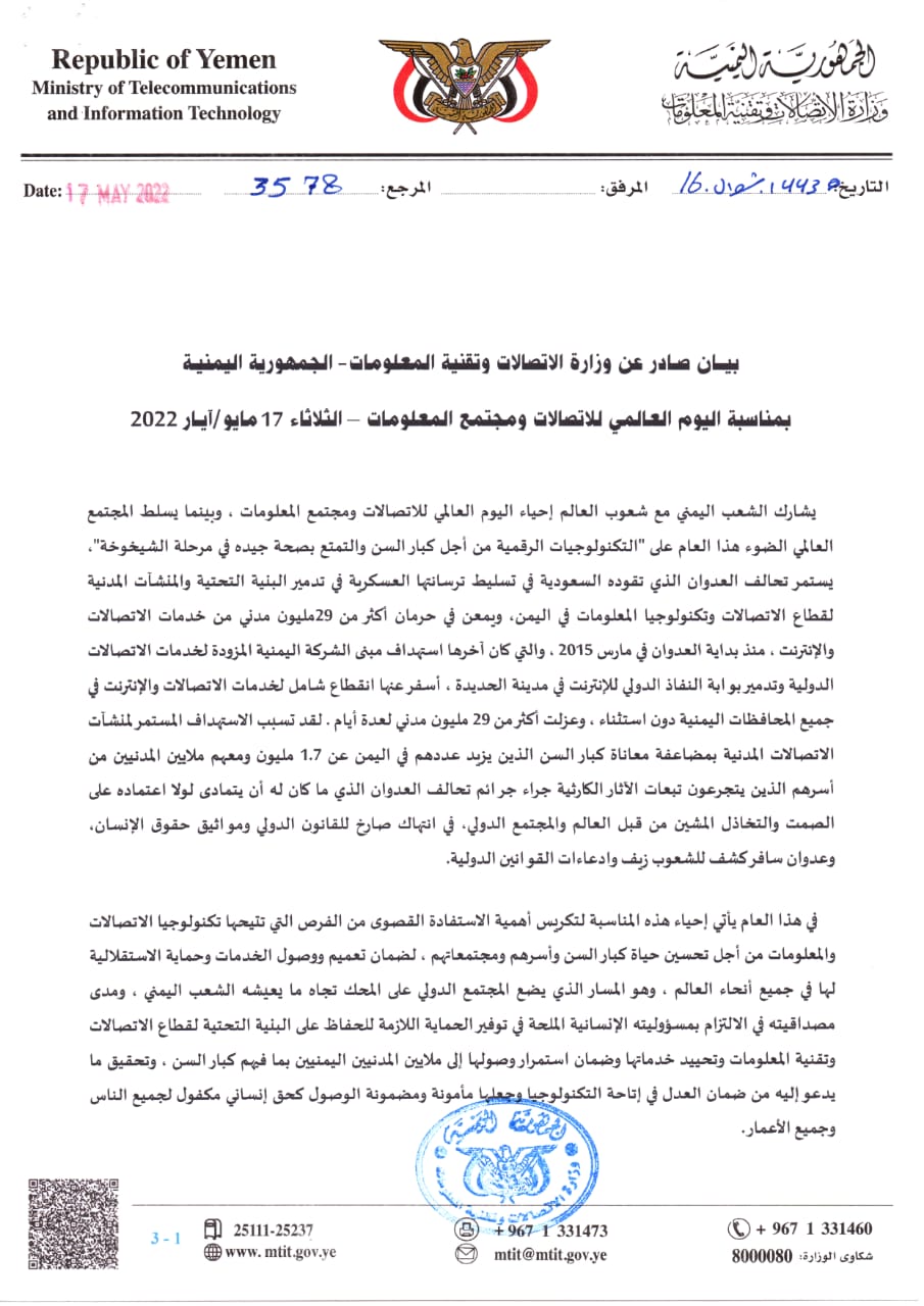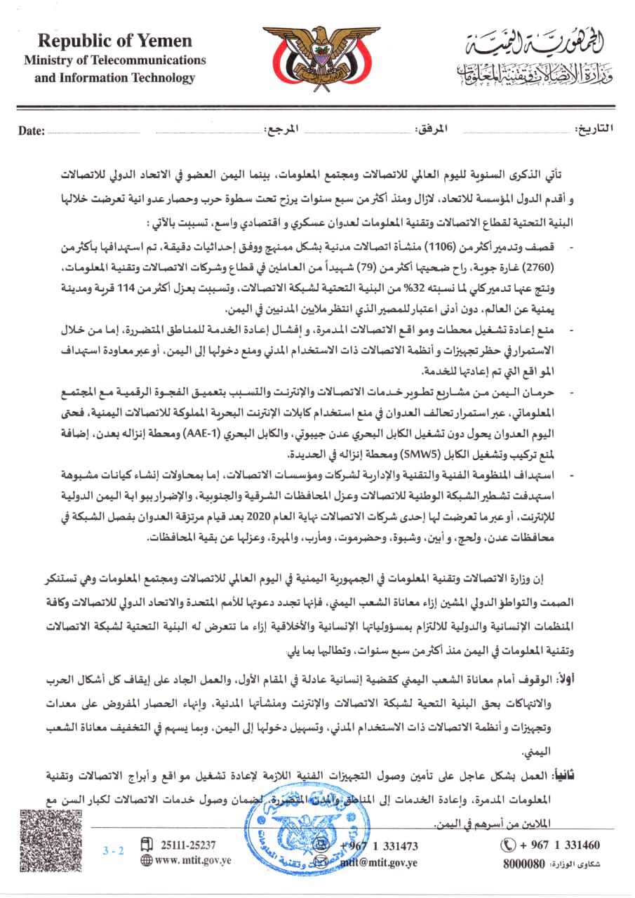 كما طالبت الوزارة في بيان صادر عنها بمناسبة اليوم العالمي للإتصالات ومجتمع المعلومات، بإنهاء الحصار المفروض على معدات وتجهيزات وأنظمة الاتصالات ذات الاستخدام المدني وتسهيل دخولها إلى اليمن بما يسهم في التخفيف من معاناة الشعب اليمني.