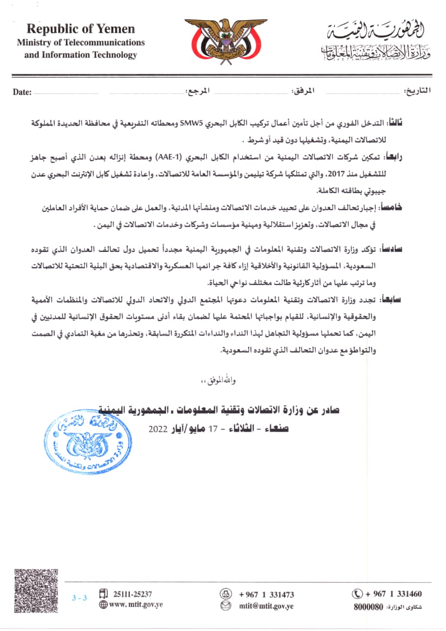 وطالب البيان بالتدخل من أجل تأمين أعمال تركيب الكابل البحري (SMWS) ومحطاته التفريعية في محافظة الحديدة المملوكة للاتصالات اليمنية وتشغيلها دون قيد أو شرط، وكذا تمكين شركات الاتصالات اليمنية من استخدام الكابل البحري (AAE-1) ومحطة إنزاله بعدن، الذي أصبح جاهزا للتشغيل منذ 2017م وتعود ملكيته لشركة تيليمن والمؤسسة العامة للاتصالات، وكذا إعادة تشغيل كابل الانترنت البحري “عدن – جيبوتي” بطاقته الكاملة.