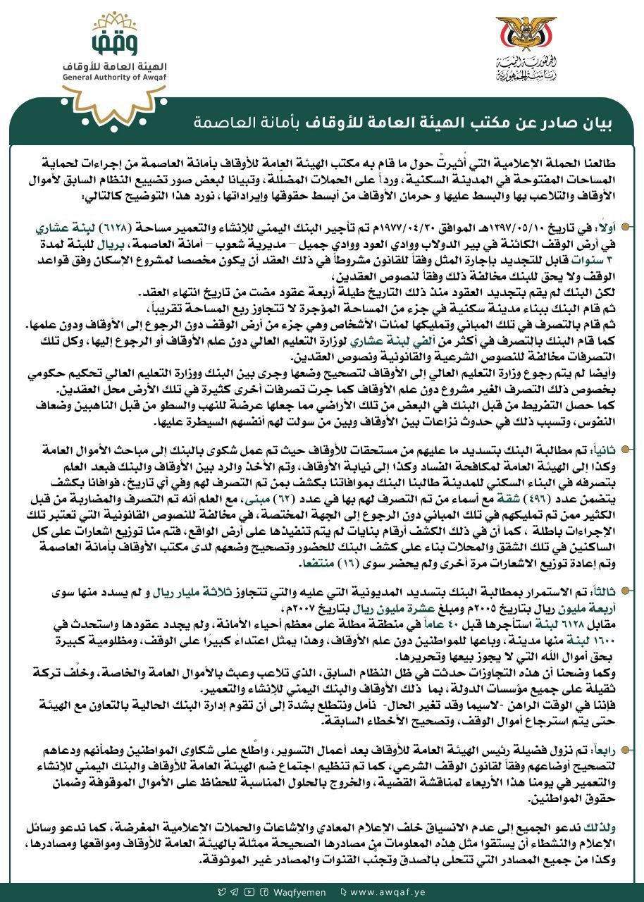 وأشار إلى أنه “تم الاستمرار بمطالبة البنك بتسديد المديونية التي عليه والتي تتجاوز ثلاثة مليار ريال و لم يسدد منها سوى أربعة مليون ريال بتاريخ 2005م ومبلغ عشرة مليون ريال بتاريخ 2007م، مقابل 6128 لبنة استأجرها قبل 40 عاماً في منطقة مطلة على معظم أحياء الأمانة، ولم يجدد عقودها واستحدث في 1600 لبنة منها مدينة، وباعها للمواطنين دون علم الأوقاف، وهذا يمثل اعتداءً كبيراً على الوقف، ومظلومية كبيرة بحق أموال الله التي لا يجوز بيعها وتحريرها”.