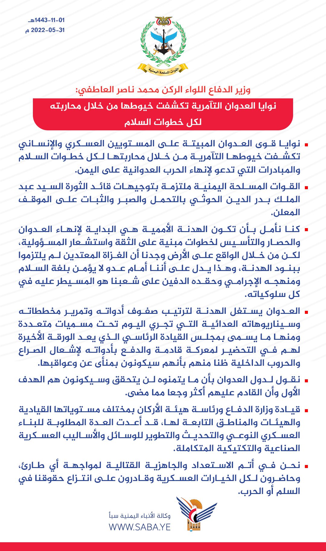 وأشار وزير الدفاع في تصريح لوكالة الأنباء اليمنية (سبأ) إلى أن القوات المسلحة اليمنية ملتزمة بتوجيهات قائد الثورة السيد عبد الملك بدر الدين الحوثي بالتحمل والصبر والثبات على الموقف المعلن.