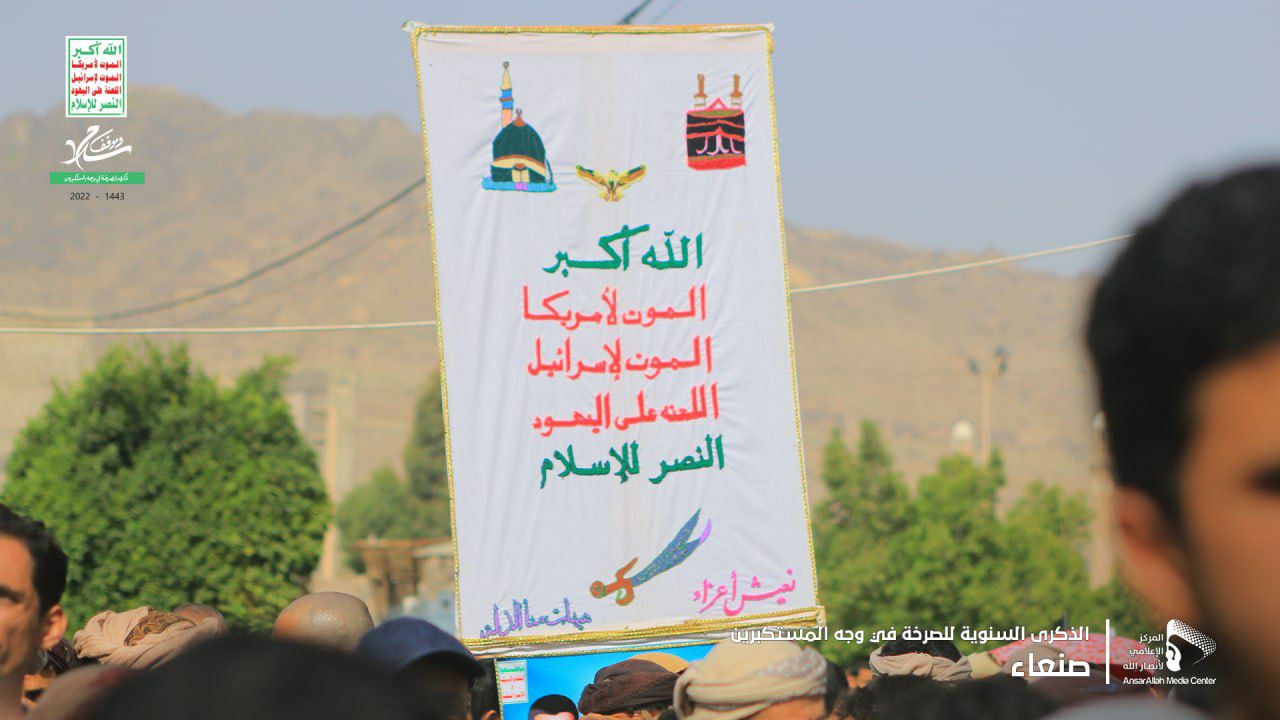 ولفتت الحشود الجماهيرية إلى دور وأهمية الشعار الذي أطلقه، الشهيد القائد، لشحذ الهمم والعزم والوعي والبصيرة، ومناهضة المشروع الاستعماري الأمريكي – الصهيوني.