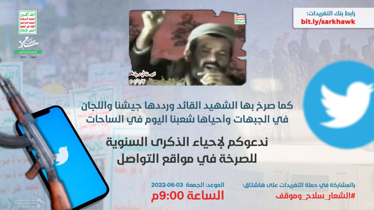 ودعا المنظمون للحملة، إلى المشاركة الفاعلة في حملة التغريدات إلى إحياء الذكرى السنوية للصرخة التي صرخ بها الشهيد القائد حسين الحوثي ورددها الجيش واللجان الشعبية في الجبهات وأحياها الشعب اليمني اليوم في الساحات على هاشتاق: #الشعار_سلاح_وموقف.