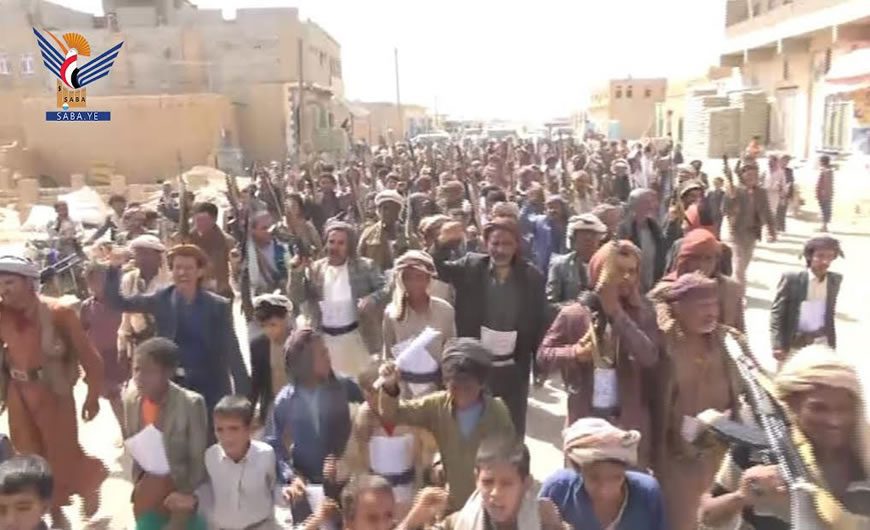 حيث خرج أبناء مديريات الجوف الأسفل بمسيرة حاشدة في سوق الاثنين بمديرية المتون، مرددين شعار الصرخة وهتافات منددة بالمخططات الأمريكية والصهيونية في المنطقة.