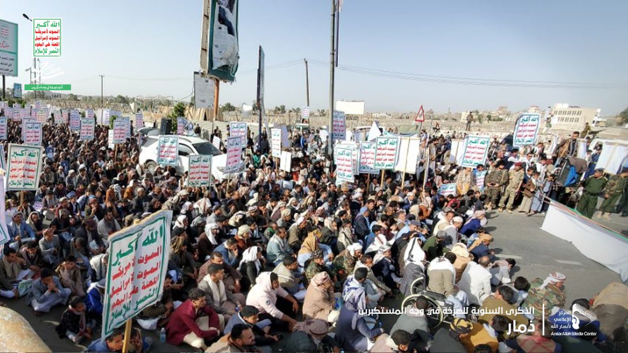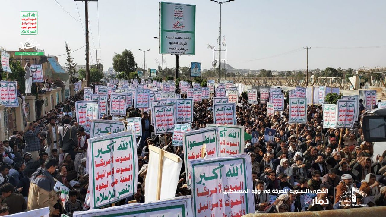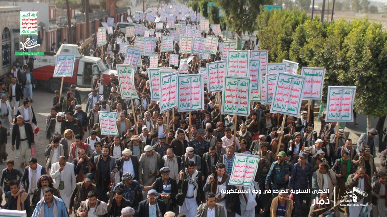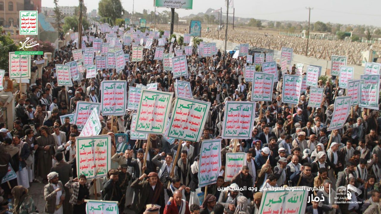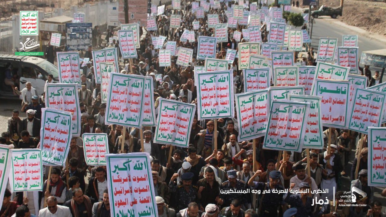 وندد ابناء ذمار باستمرار العدوان والحصار المفروض على اليمن ، والهيمنة الغربية والتطبيع الذي اقدمت عليه بعض الأنظمة العربية مع الكيان الصهيوني.