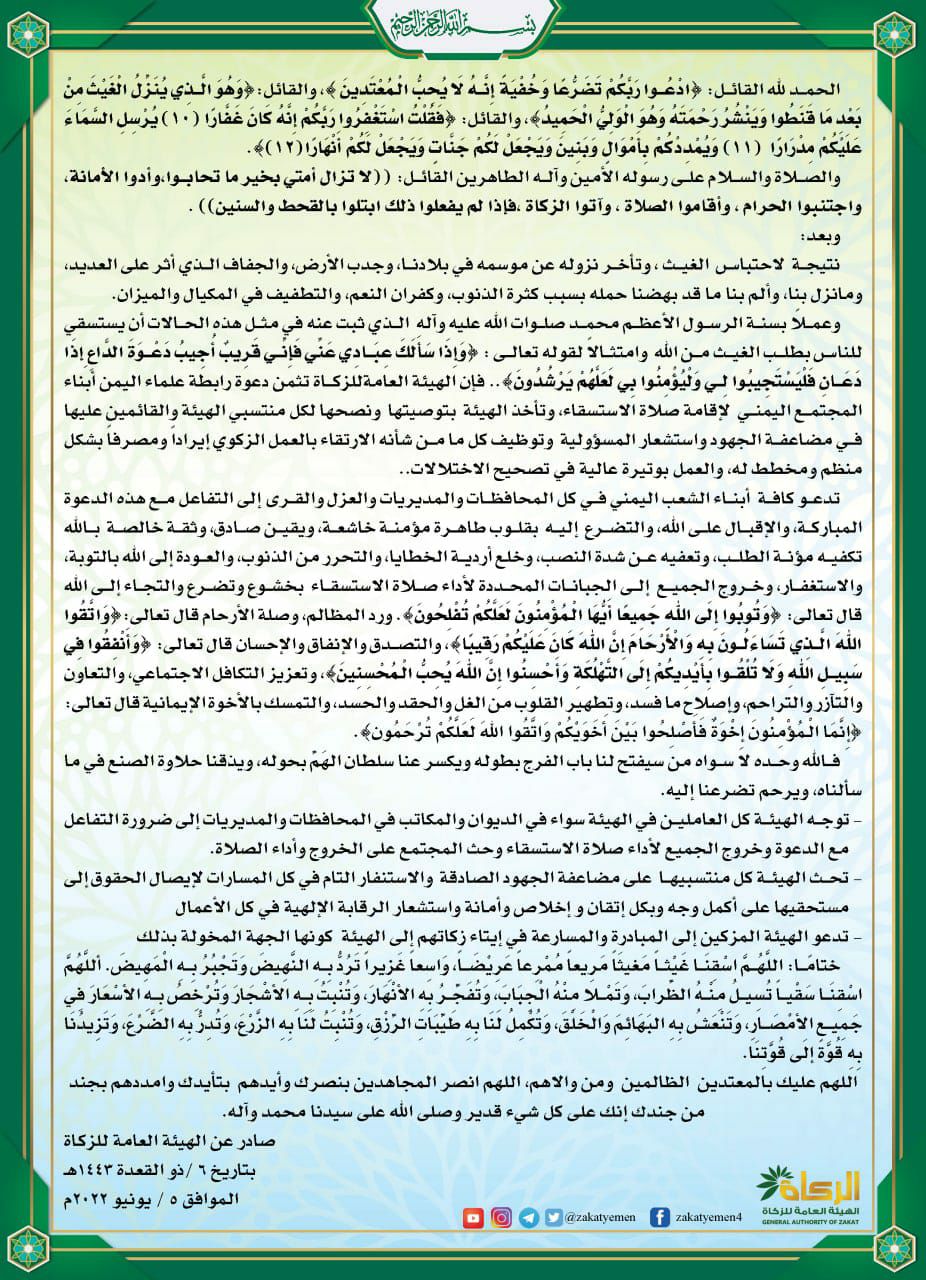 وثمن بيان هيئة الزكاة دعوة رابطة علماء اليمن أبناء المجتمع اليمني لإقامة صلاة الإستسقاء.