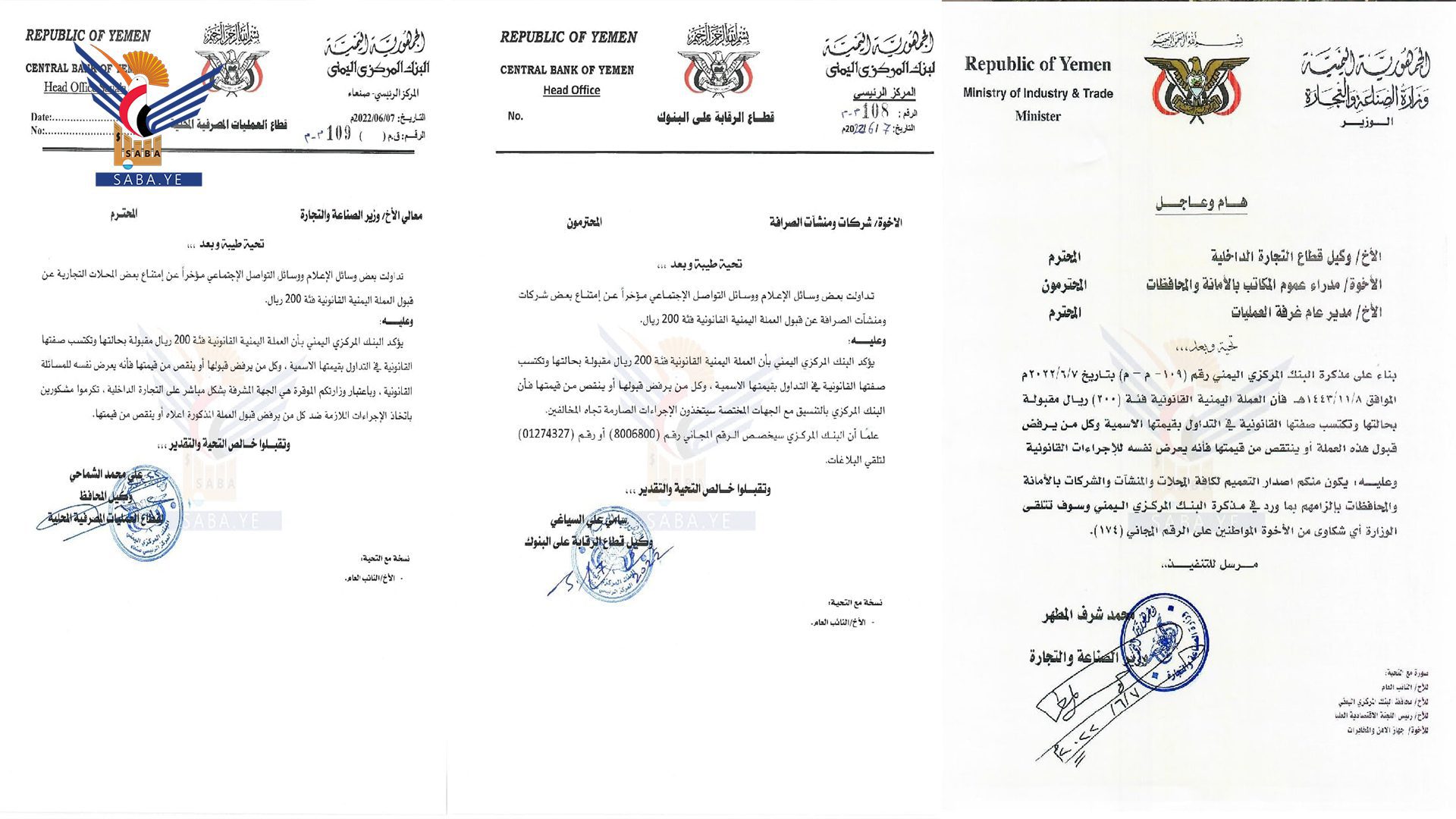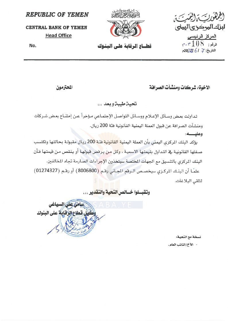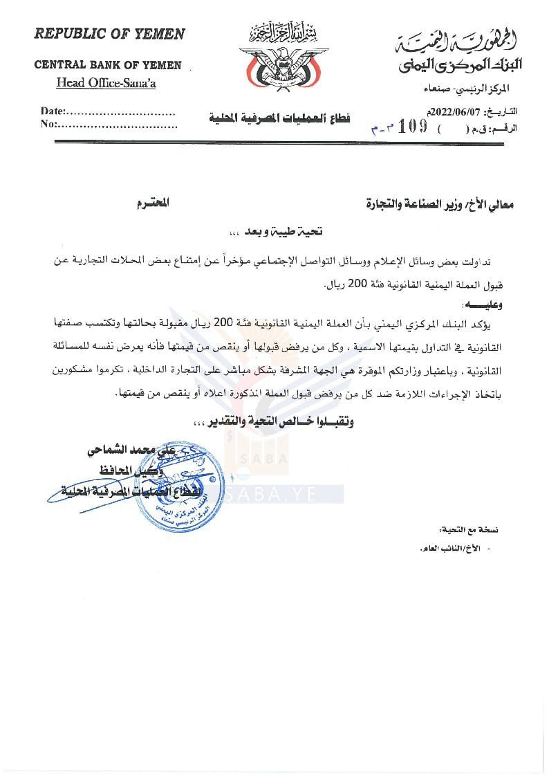 كما وجه البنك المركزي مذكرة إلى وزير الصناعة والتجارة، أكد فيها أن العملة اليمنية القانونية فئة (200) ريال مقبولة بحالتها وتكتسب صفتها القانونية في التداول بقيمتها الأسمية وكل من يرفض قبولها أو إنقاص قيمتها فإنه يعرض نفسه للمساءلة القانونية.
