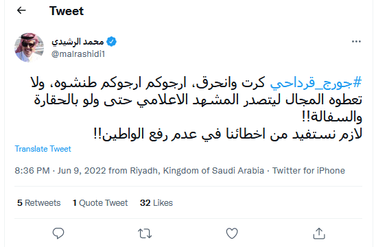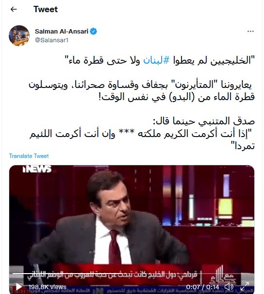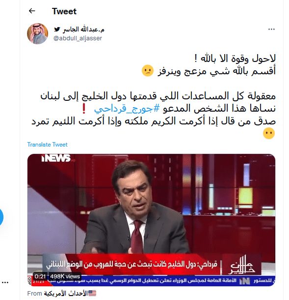 وتداول مغردون على موقع “تويتر” مقطعا من مقابلة أجراها قرداحي قبل أسبوعين مع قناة عراقية، يقول فيها في إطار حديثه عن الأزمة التي تسببت تصريحاته بجزء منها: “إخواننا الخليجيون يقولون نحن سنترك لبنان، لقد تركوا لبنان منذ زمن”.