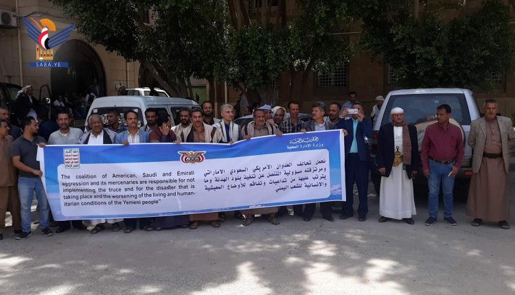 نظمت قيادة ومنتسبو وزارة الإدارة المحلية بصنعاء، اليوم الثلاثاء، وقفة احتجاجية للتنديد بإساءة المتحدث باسم الحزب الحاكم الهندي للرسول الكريم، وكذا استمرار تحالف العدوان بخرق الهدنة.