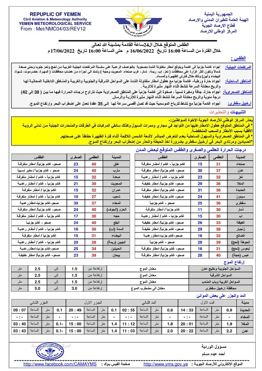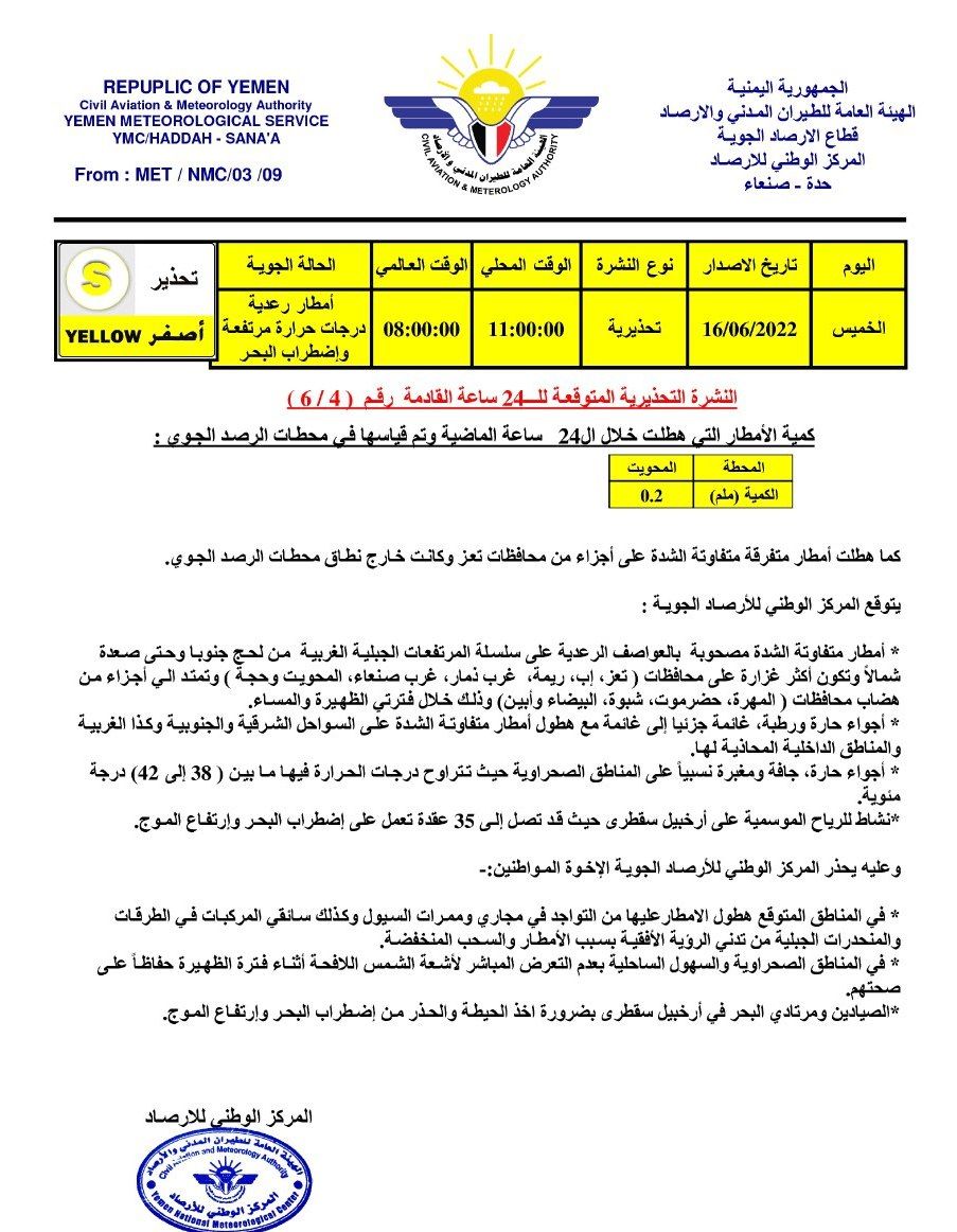 وحث المواطنين في المناطق الصحراوية والسهول الساحلية على عدم التعرض المباشر لأشعة الشمس اللافحة أثناء فترة الظهيرة حفاظاً على صحتهم، داعياً الصيادين ومرتادي البحر في أرخبيل سقطرى إلى أخذ الحيطة والحذر من اضطراب البحر وارتفاع الموج.