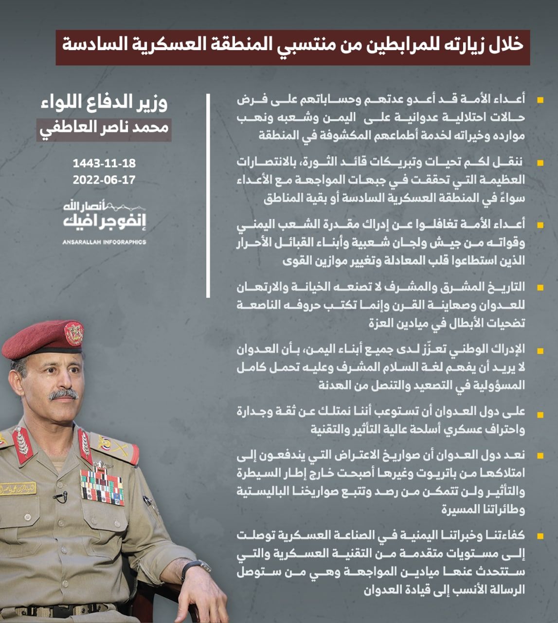 جاء ذلك خلال زيارة وزير الدفاع للمرابطين من منتسبي المنطقة العسكرية السادسة، الذين نقل لهم تحيات وتبريكات قائد الثورة، بالانتصارات العظيمة التي تحققت في جبهات المواجهة مع الأعداء سواءً في المنطقة العسكرية السادسة أو بقية المناطق.
