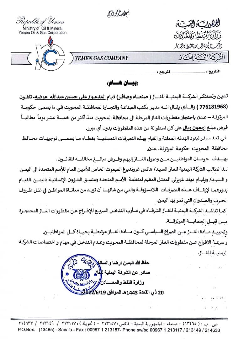 واستنكرت الشركة في بيانها، “قيام المدعو علي حسين عبدالله عوضه، منتحل صفة مدير مكتب الصناعة والتجارة لمحافظة المحويت في حكومة المرتزقة، باحتجاز مقطورات الغاز المرحلة إلى محافظة الحويت منذ أكثر من خمسة عشر يوماً مطالباً فرض مبالغ أربعون ريال على كل أسطوانة من هذه المقطورات بدون أي مبرر”.