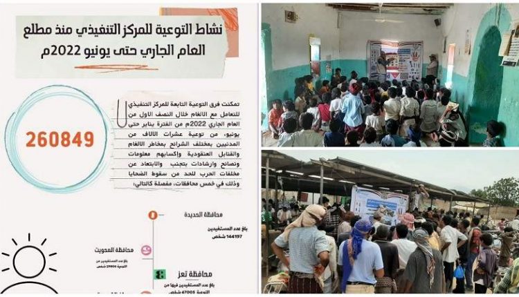 تمكنت فرق التوعية التابعة للمركز التنفيذي للتعامل مع الألغام خلال النصف الأول من العام الجاري ٢٠٢٢ من الفترة من يناير حتى يونيو، من توعية عشرات الآلاف من المدنيين بمختلف الشرائح بمخاطر الألغام والقنابل العنقودية.