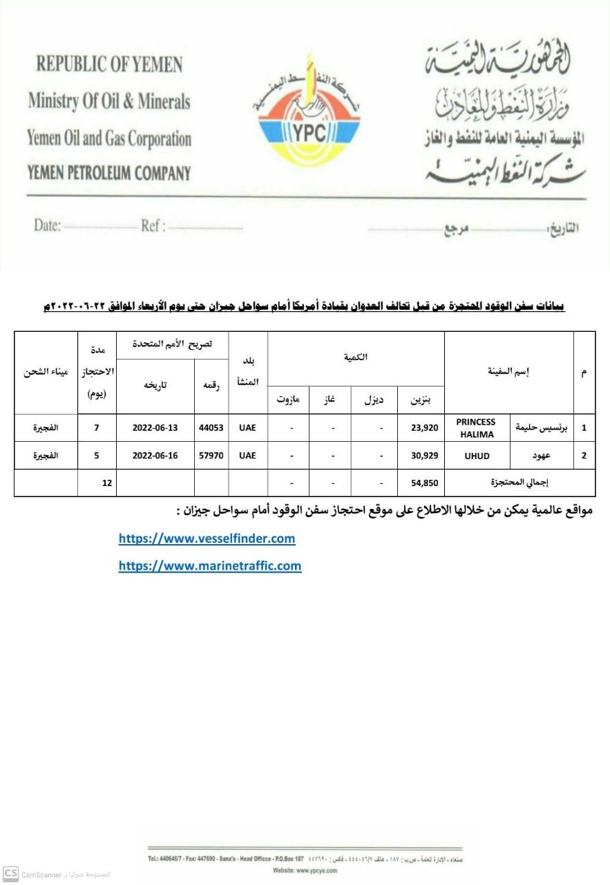وجددت شركة النفط اليمنية بصنعاء في بيان اليوم الأربعاء، التأكيد على استمرار تحالف العدوان في احتجاز سفينتين نفطيتين بحمولة إجمالية تبلغ “54.850” طناً من مادة البنزين، ولفترات متفاوتة بلغت بالنسبة للسفن المحتجزة حالياً “7” أيـام، من القرصنة البحرية.