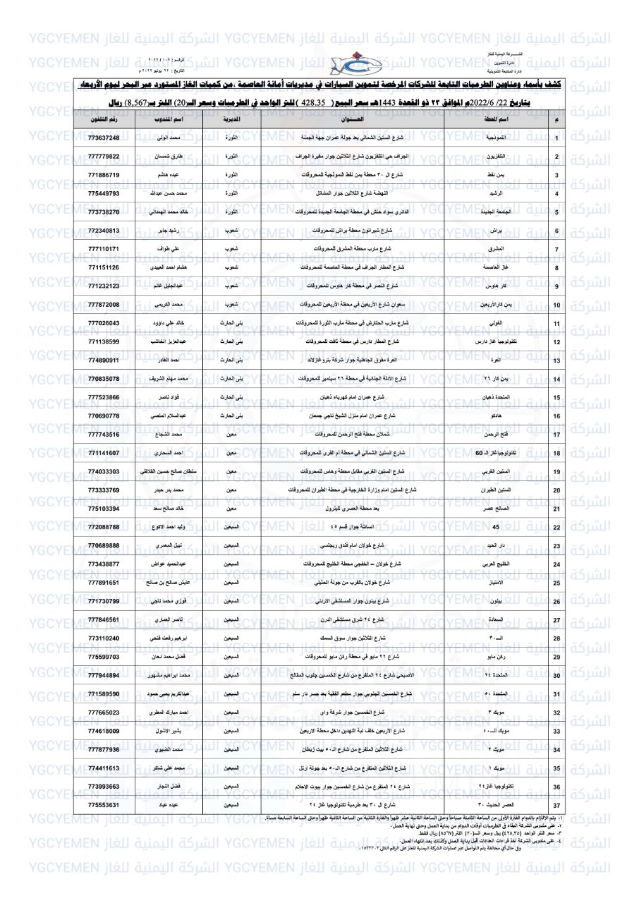 واكتفت الشركة بانزال كشف محطات تعبئة السيارات في مديريات أمانة العاصمة صنعاء من كميات الغاز المستورد عبر البحر ليوم الأربعاء الموافق 22 يونيو 2022م، مؤكدة بأن سعر بيع اللتر الواحد في الطرمبات لا يزال بـ ( ٤٢٨,٣٥ ريال ) وسعر الـ 20 اللتر بـ ( ٨,٥٦٧ ريال ).