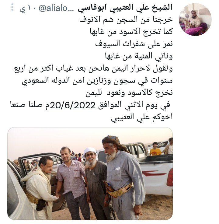 وبحسب مصادر إعلامية، فقد وصل الشيخ علي العتيبي بــ”أبو قاسي” بمعية العشرات من أفراد قبيلته ومرافقيه إلى العاصمة صنعاء، أمس، بعد أيام من إفراج السعودية عنه المعتقل لديها منذ 4 سنوات.