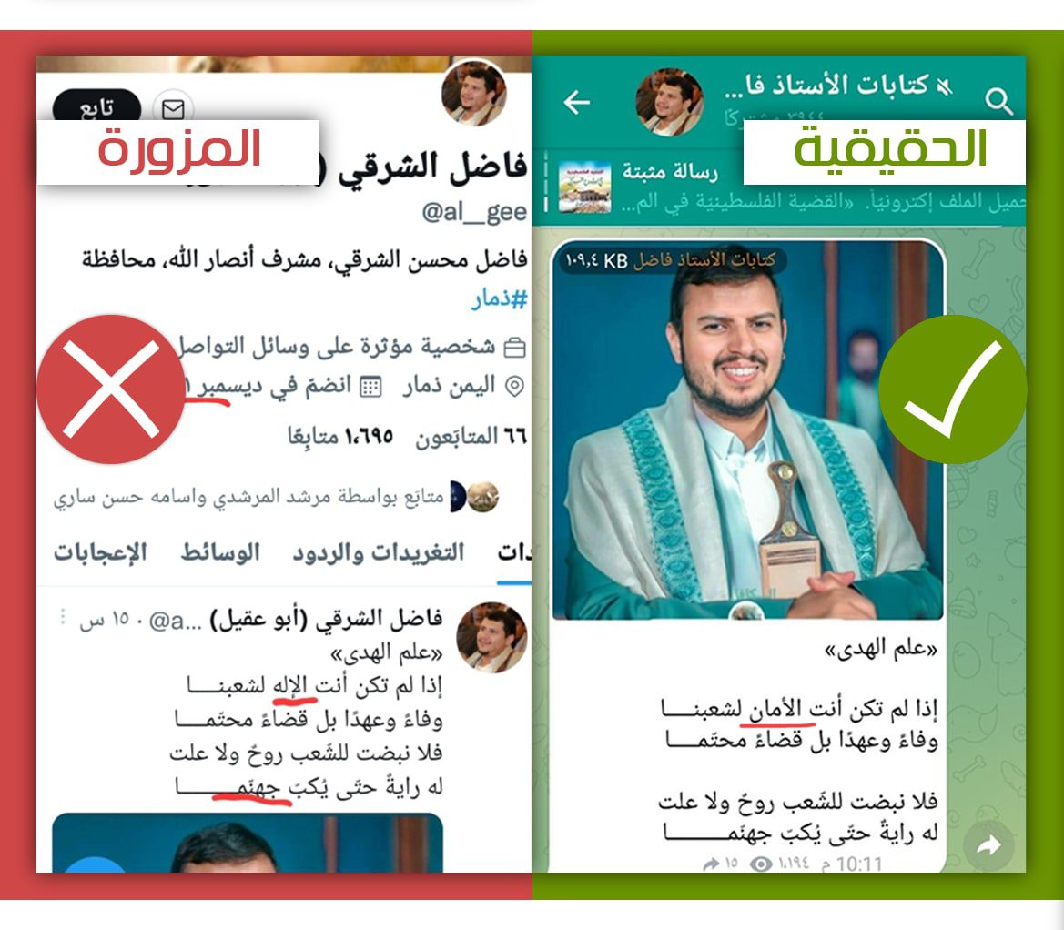 ويأتي هذا بعد نشر مرتزقة وأبواق العدوان قصيدة نسبوها للأستاذ فاضل الشرقي، وبعد التأكد تبين أن الحساب الذي استندوا إليه في موقع (تويتر) حساب مزور ينتحل اسم الشرقي وأن القصيدة محرفة من قصيدة كان قد نشرها بقناته الرسمية في التليجرام كما هو واضح في الصورة، وبالإمكان الرجوع إلى قناة التليجرام للتأكد على هذا الرابط: (t.me/ALshargee/2014).