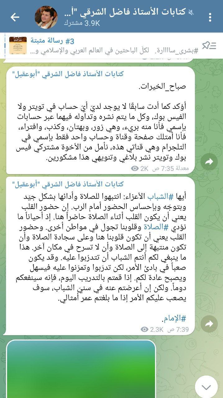 وقال الشرقي في منشور على قناته بتطبيق “تليجرام” : “أؤكد كما أكدت سابقاً لا يوجد لديّ أيّ حساب في تويتر ولا الفيس بوك، وكل ما يتم نشره وتداوله فيهما عبر حسابات بإسمي فأنا منه بريء، وهي زور، وبهتان، وكذب، وافتراء، فأنا أمتلك صفحة وقناة وحساب واحد فقط بإسمي في التلجرام وتحمل هذا الرابط” ( https://t.me/ALshargee ).