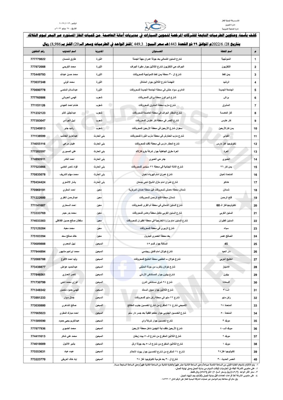 إلى ذلك، نشرت الشركة اليمنية للغاز عبر صفحاتها الرسمية على مواقع التواصل الإجتماعي، كشوفات توزيع الغاز المنزلي عبر عقال الحارات في مديريات أمانة العاصمة صنعاء ليوم الثلاثاء الموافق ٢٨ يونيو ٢٠٢٢م وبسعر (٥٩٠٠ ريال) ، بالإضافة إلى كشف توزيع الغاز للحارات ” نظام شركة ” لمديريات ( صنعاء القديمة – التحرير – الصافية – همدان ) وسعر الاسطوانة بـ ( ٤,٩٥٠ ريال ) ، كما نشرت الشركة كشف بأسماء وعناوين الطرمبات لتموين السيارات من كميات الغاز المستورد عبر البحر حيث أن سعر اللتر الواحد بـ ( ٤٤٩.٣ ريال )  والـ ٢٠ لتر بـ ( ٨,٩٨٦ ريال ).