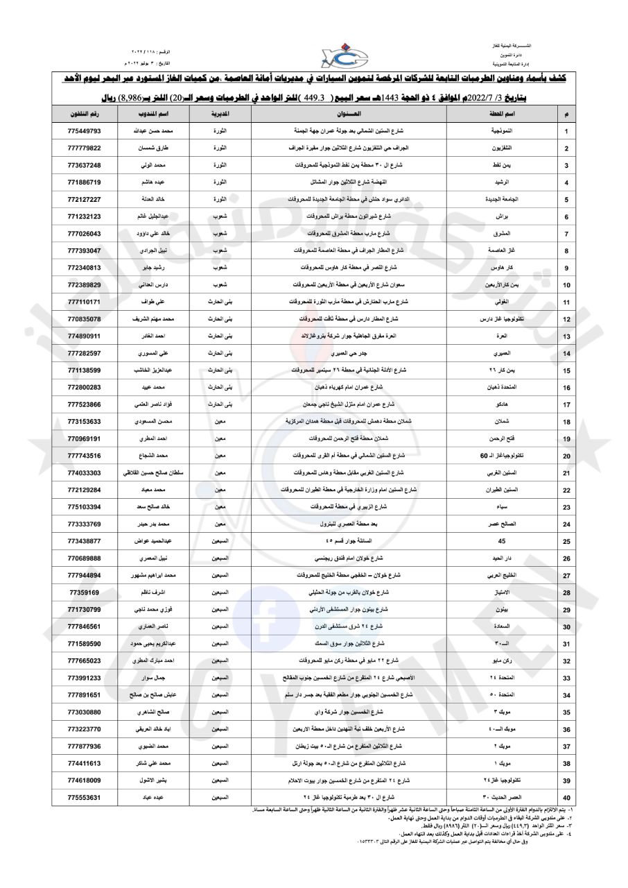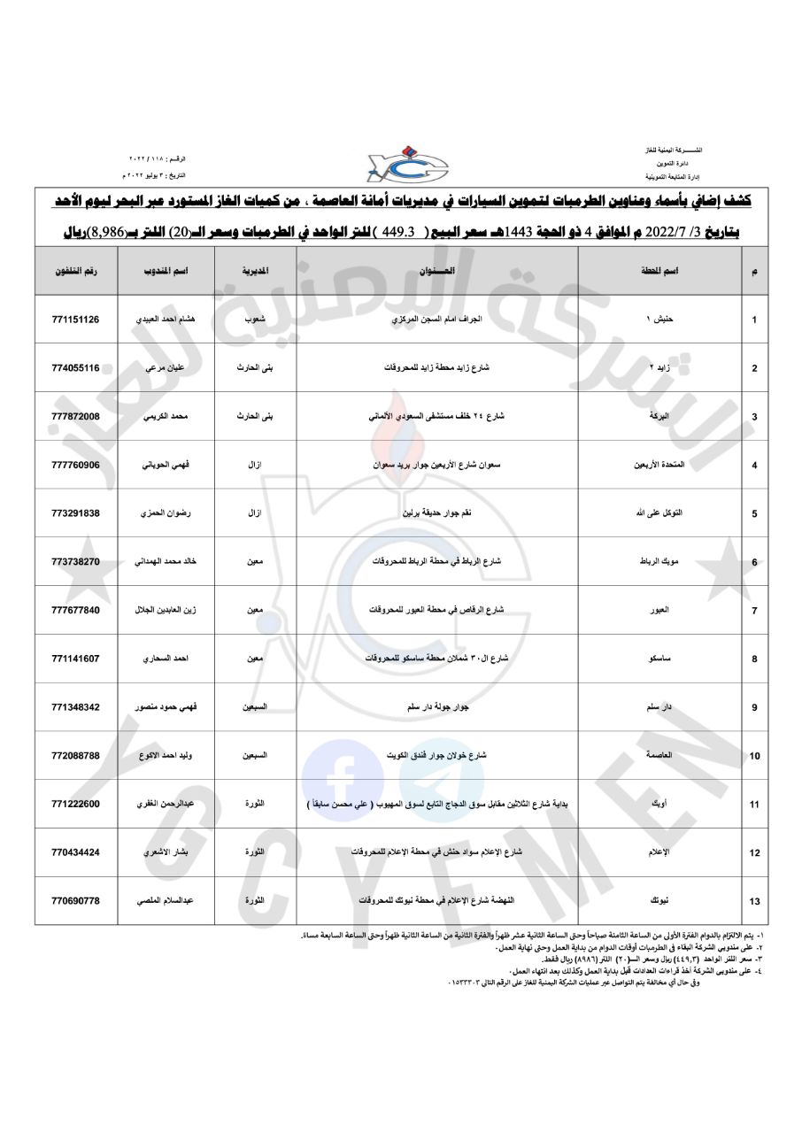 *كشف بأسماء وعناوين الطرمبات لتموين السيارات في مديريات أمانة العاصمة صنعاء من كميات الغاز المستورد عبر البحر ليوم الأحد الموافق 3 يوليو 2022م:
