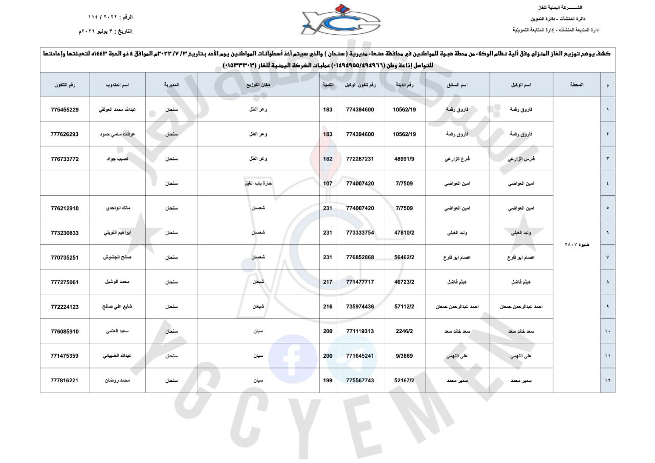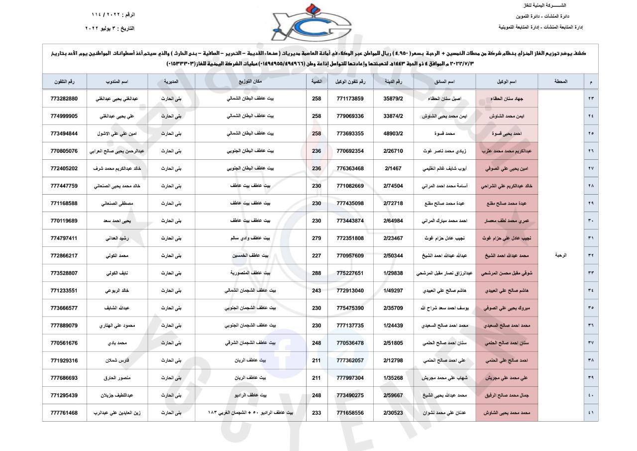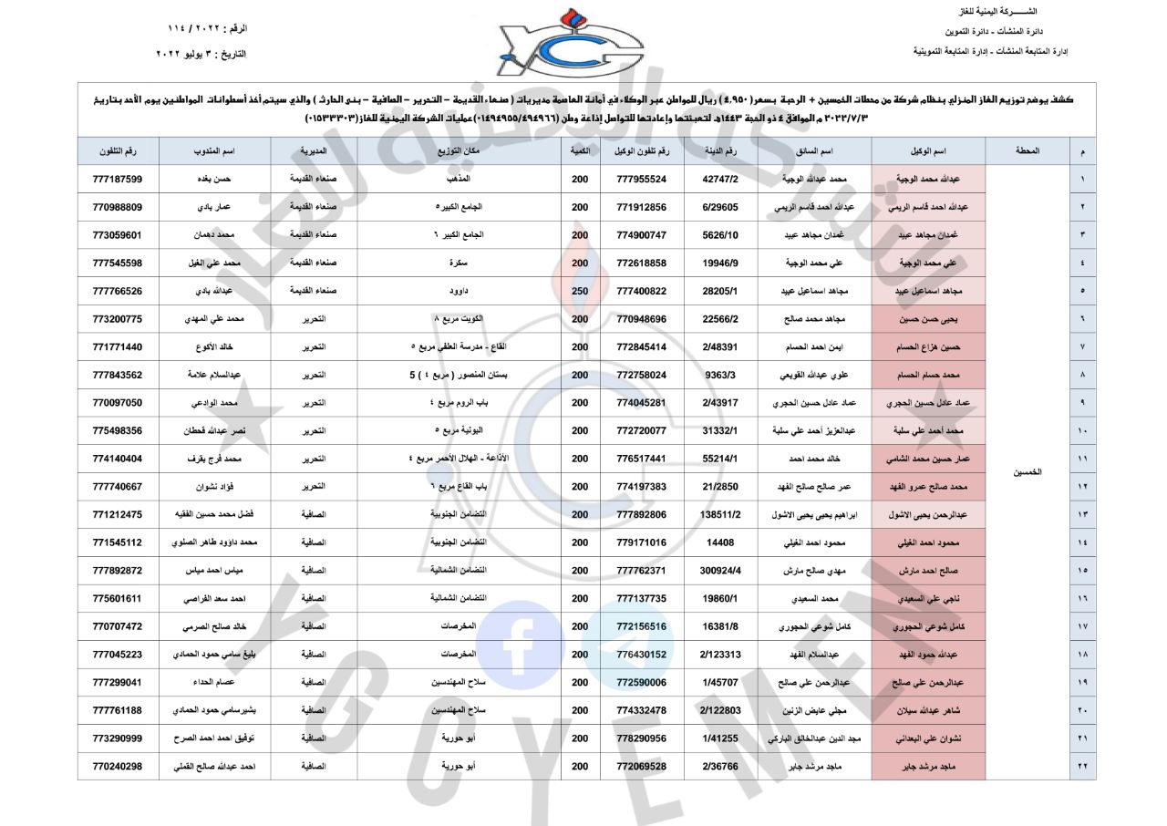 كشوفات توزيع أسطوانات الغاز المنزلي عبر عقال الحارات ومحطات التعبئة في العاصمة صنعاء ليوم الأحد 3 يوليو