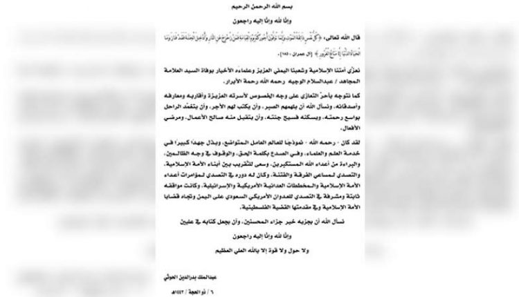 تقدم السيد عبدالملك بدرالدين الحوثي، اليوم الثلاثاء، بالعزاء للشعب اليمني والأمة الإسلامية في وفاة أمين عام رابطة علماء اليمن العلامة المجاهد عبدالسلام الوجيه.