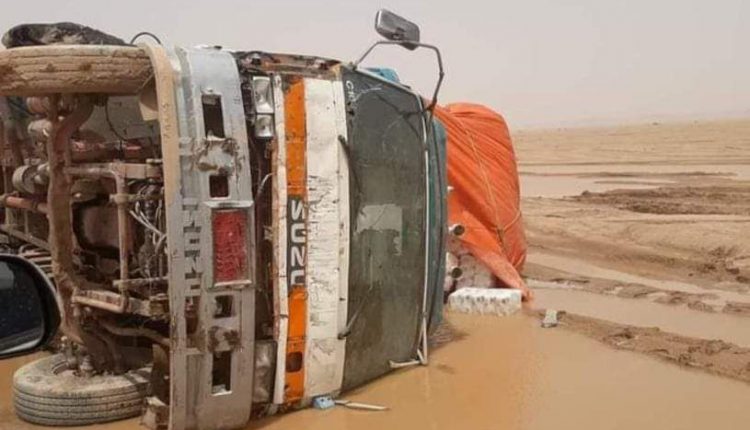 انجراف العديد من القاطرات والشاحنات التجارية جراء السيول بمأرب