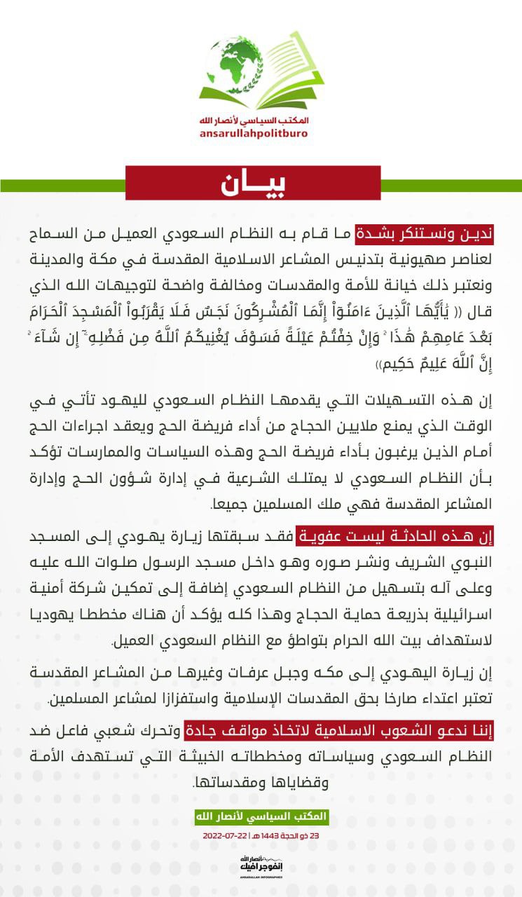 وأوضح المكتب السياسي لأنصار الله في بيان صادر عنه، بأن التسهيلات التي يقدمها النظام السعودي لليهود تأتي في الوقت الذي يمنع ملايين الحجاج من أداء فريضة الحج.