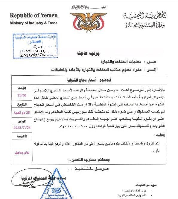 أصدرت وزارة الصناعة والتجارة بصنعاء، قراراً بتخفيض ومراقبة أسعار الدجاج المشوي، ووجهت بالنزول الميداني لضبط وإلزام المطاعم والشوايات ببيعها بسعر 2000 ريال للدجاجة الواحدة، وذلك بعد انخفاض أسعار الدجاج المحلي في الأسواق المركزية مقارنةً بالفترة الماضية.