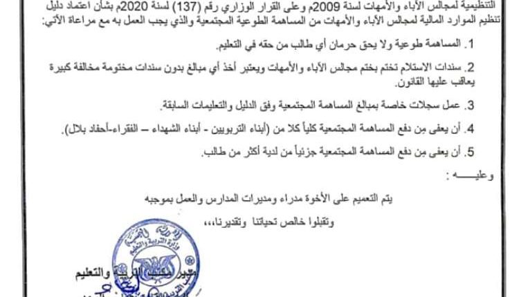 واعفا التعميم ابناء التربويين وابناء الشهداء والفقراء واحفاد بلال من تلك المبالغ وكذلك يعفى جزئيا من الدفع من لديه اكثر من طالب.