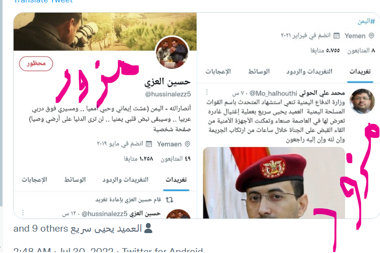 وحذر المصدر من الحسابات المزورة على مواقع التواصل الإجتماعي، موضحاً أن هنالك حسابين مزورين الأول باسم الأستاذ حسين العزي والآخر باسم الأستاذ محمد علي الحوثي ، قاما بنعي استشهاد الناطق الرسمي للقوات المسلحة اليمنية العميد #يحيى_سريع ، وزعما انه قد تعرض لإغتيال داخل العاصمة صنعاء حسب قولهم.
