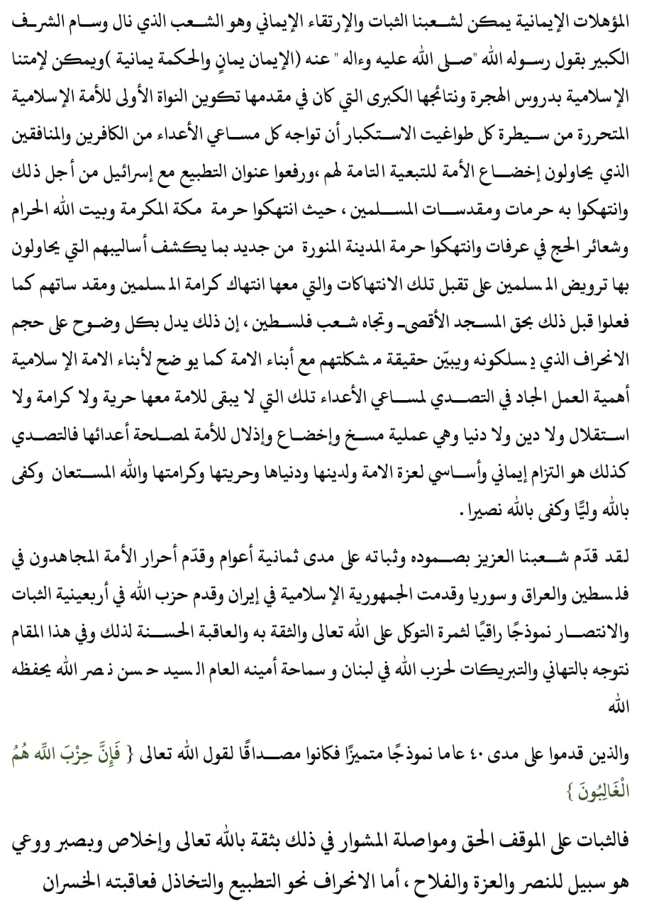 وأشار إلى أن شعبنا العزيز وأحرار الأمة في فلسطين والعراق وسوريا وإيران وحزب الله، قدموا نموذجًا راقيًا لثمرة التوكل على الله والثقة به والعاقبة الحسنة.