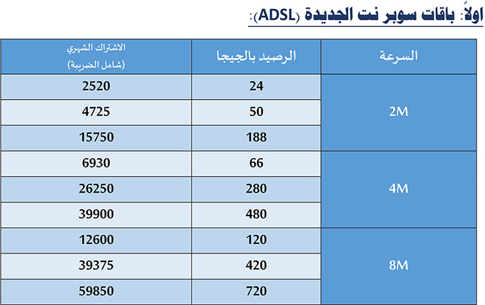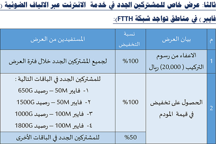 وأشار إلى أن المؤسسة تقدم تخفيضات وعروض باقات جديدة بأحجام متعددة وأسعار مناسبة لخدمات الانترنت الثابت عريض النطاق (ADSL-FTTH) تشمل تخفيض في سعر الجيجا وزيادة في الأرصدة، وإنزال عرض مصاحب يشمل إعفاء الأفراد من رسوم إدخال خدمة الإنترنت عبر الألياف الضوئية (FTTH) ومنحهم تخفيضات في أسعار المودمات للمشتركين الجدد.