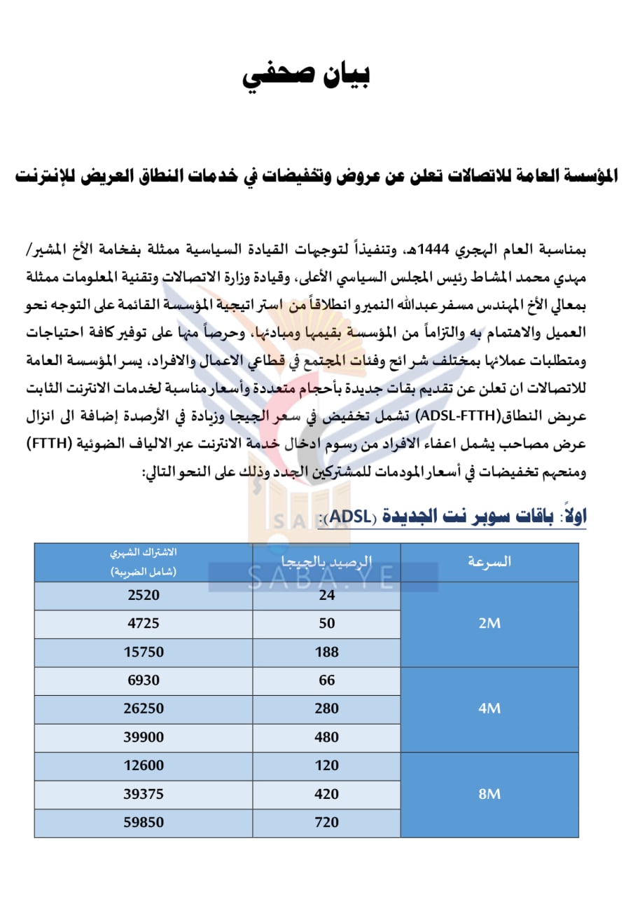 وجاء في البيان الصحفي الذي نشرته المؤسسة العامة للإتصالات بصنعاء، عن تخفيض سعر الجيجا وزيادة الرصيد بشكل دائم في باقات سوبر نت 2 ميجا – 4 ميجا – 8 ميجا، إبتداءً من 1 أغسطس 2022م
