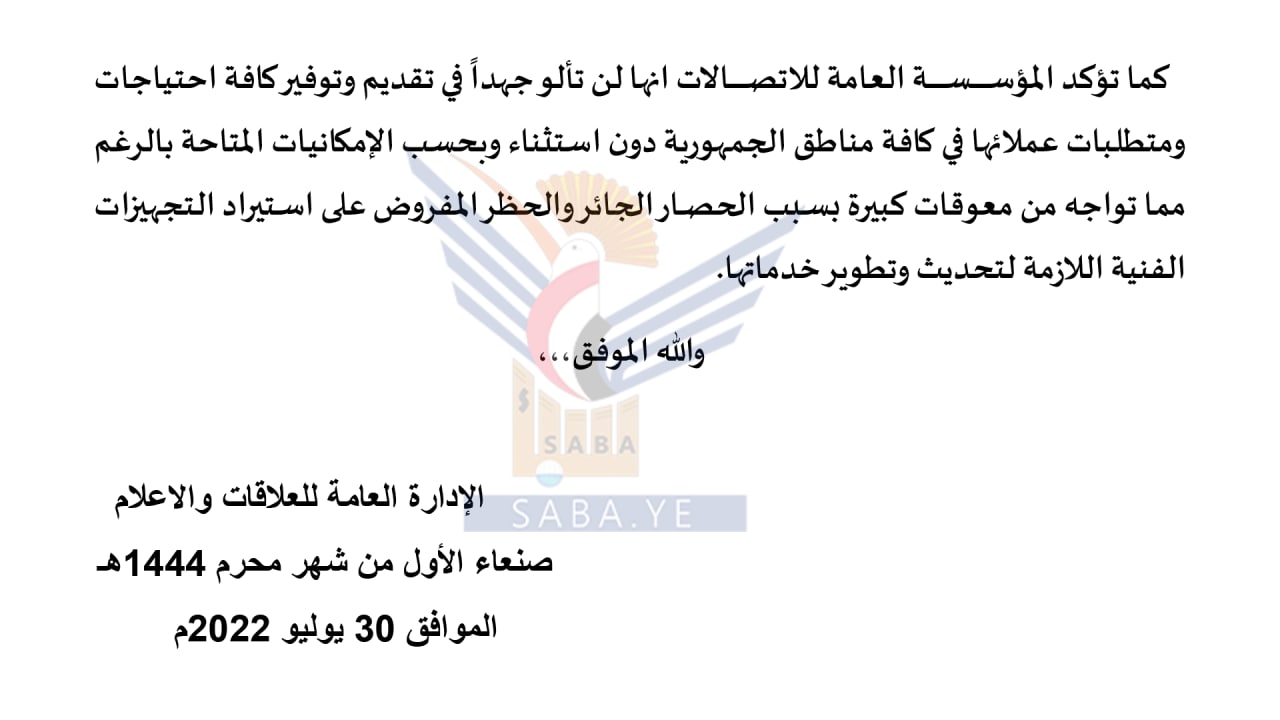 كما أكد وزير الاتصالات أن المؤسسة لن تدخر جهداً في تقديم وتوفير احتياجات ومتطلبات عملائها في كافة مناطق الجمهورية دون استثناء وبحسب الإمكانيات المتاحة بالرغم مما تواجه من معوقات بسبب الحصار والحظر المفروض على استيراد التجهيزات الفنية اللازمة لتحديث وتطوير خدماتها.