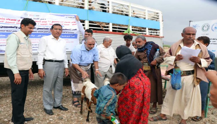 دشن فرع المجلس الأعلى لإدارة وتنسيق الشؤون الإنسانية ومكتب الزراعة في محافظة حجة، اليوم، مشروع توزيع اغنام لأسر النازحين في عدد من المديريات.