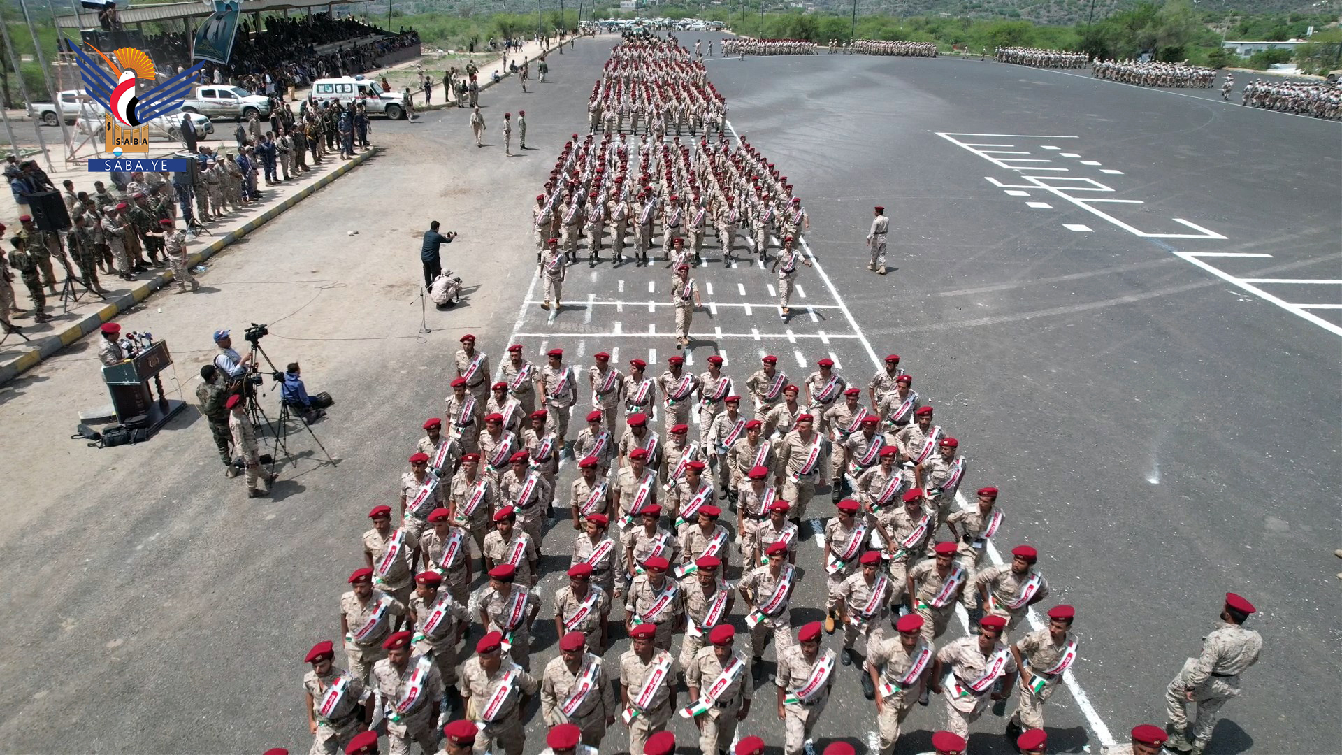 شهد الحفل عرض عسكري مهيب، وتكريم قائد كتائب الدعم والإسناد اللواء قاسم الحمران، من قبل خريجي الدفعة الثانية عشرة دفعة “الاقصى الشريف”.