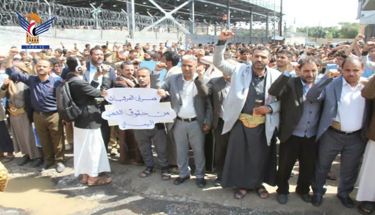 حيث نظم أبناء مديرية الصافية بأمانة العاصمة صنعاء اليوم، وقفة احتجاجية لمطالبة الأمم المتحدة بالوفاء بالتزاماتها لصرف مرتبات موظفي الدولة. وطالب المشاركون في الوقفة الأمم المتحدة بالتحرك الصادق لتنفيذ شروط الهدنة والوفاء بتعهداتها في تسليم مرتبات موظفي الدولة.. مستنكرين إصرار تحالف العدوان على تأزيم الأوضاع وعرقلة أي مبادرات باتجاه إيقاف العدوان وإنهاء معاناة اليمنيين.