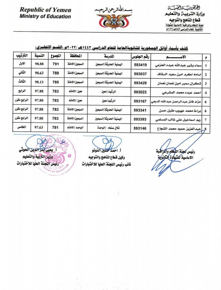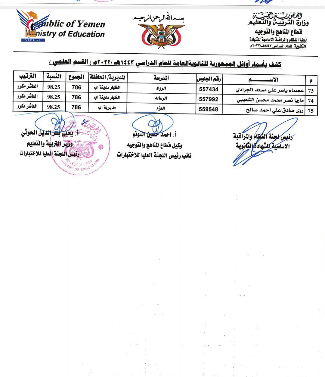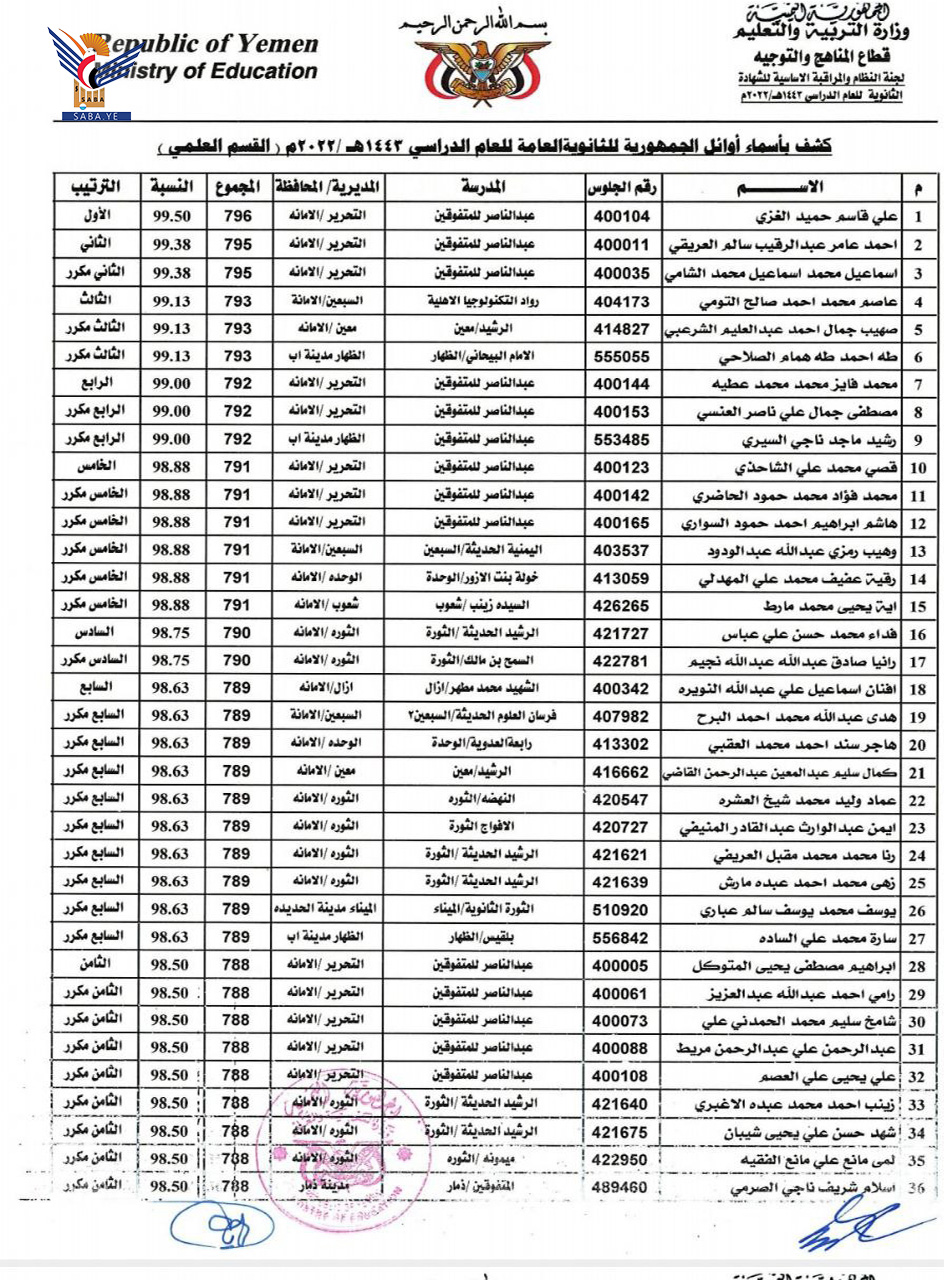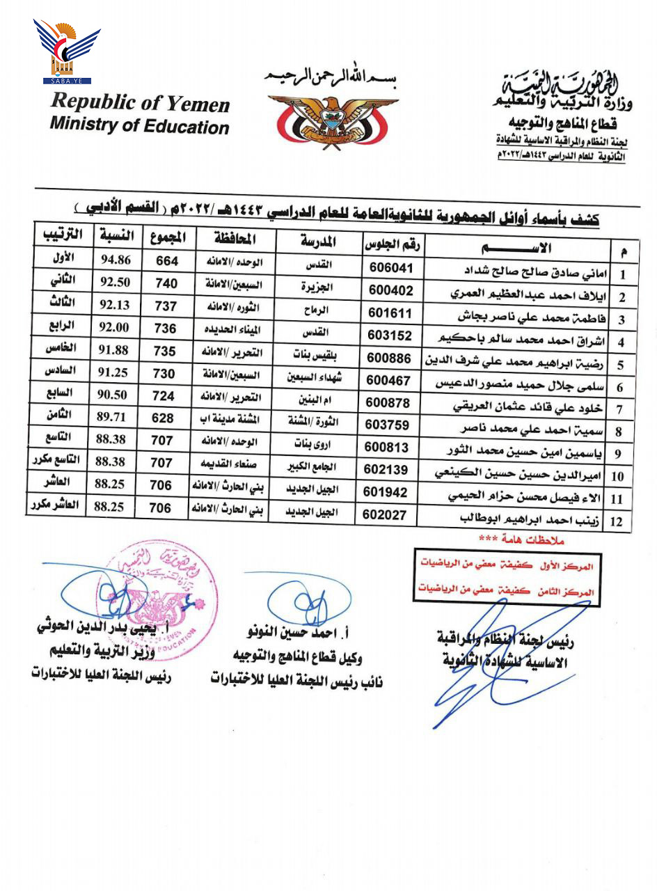 نشرت وزارة التربية والتعليم في صنعاء، أمس الأحد، قوائم أسماء الطلاب والطالبات الأوائل بالجمهورية في الثانوية العامة بأقسامها ”العلمي ، الأدبي ، الإنجليزي” للعام الدراسي ١٤٤٣هـ الموافق ٢٠٢١/ ٢٠٢٢م.