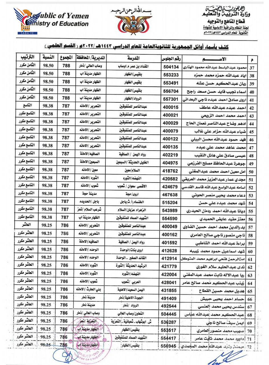 كشوفات أسماء الطلاب والطالبات الأوائل في أقسام الثانوية العامة للعام الدراسي 2021 – 2022 في اليمن