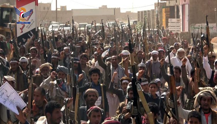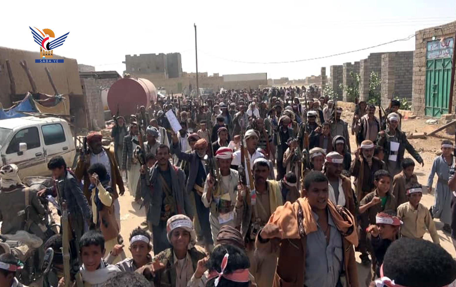 حيث خرج أبناء مديريات الحزم والمتون والزاهر والمصلوب والغيل والمطمة في مسيرة حاشدة بسوق الاثنين في مديرية المتون، رفع خلالها المشاركون الشعارات واللافتات المؤكدة السير على خطى الإمام زيد -عليه السلام- في مواجهة الطغاة والمستكبرين من قوى العدوان الأمريكي – السعودي – الإماراتي.