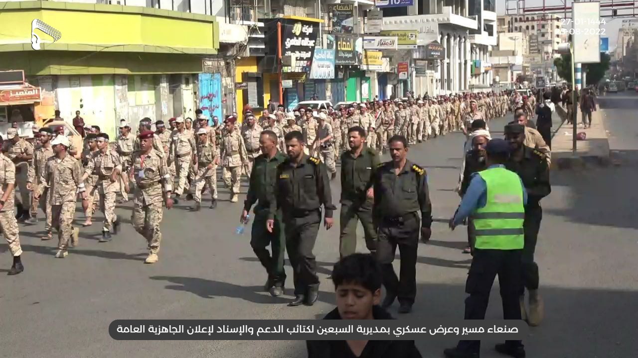 وبدأ العرض العسكري والمسير الراجل لوحدات قوات الدعم والإسناد من شارع تعز مروراً بجولة المرور وصولاً إلى شارع 22 مايو، بمشاركة، قيادات محلية وتنفيذية وأمنية وعسكرية وشخصيات اجتماعية ومشايخ.